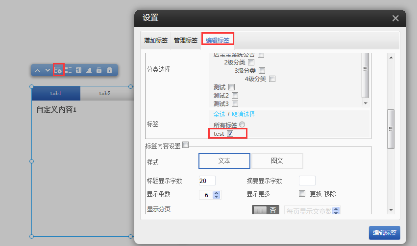 5,同理,选项卡插件中,选择文章数据源之后,也可以通过标签来控制文章列表的显示。
