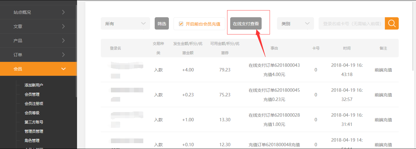 ⑥.后台---会员---会员交易里,点击“在线支付查看”,管理员可以查看用户的在线支付订单